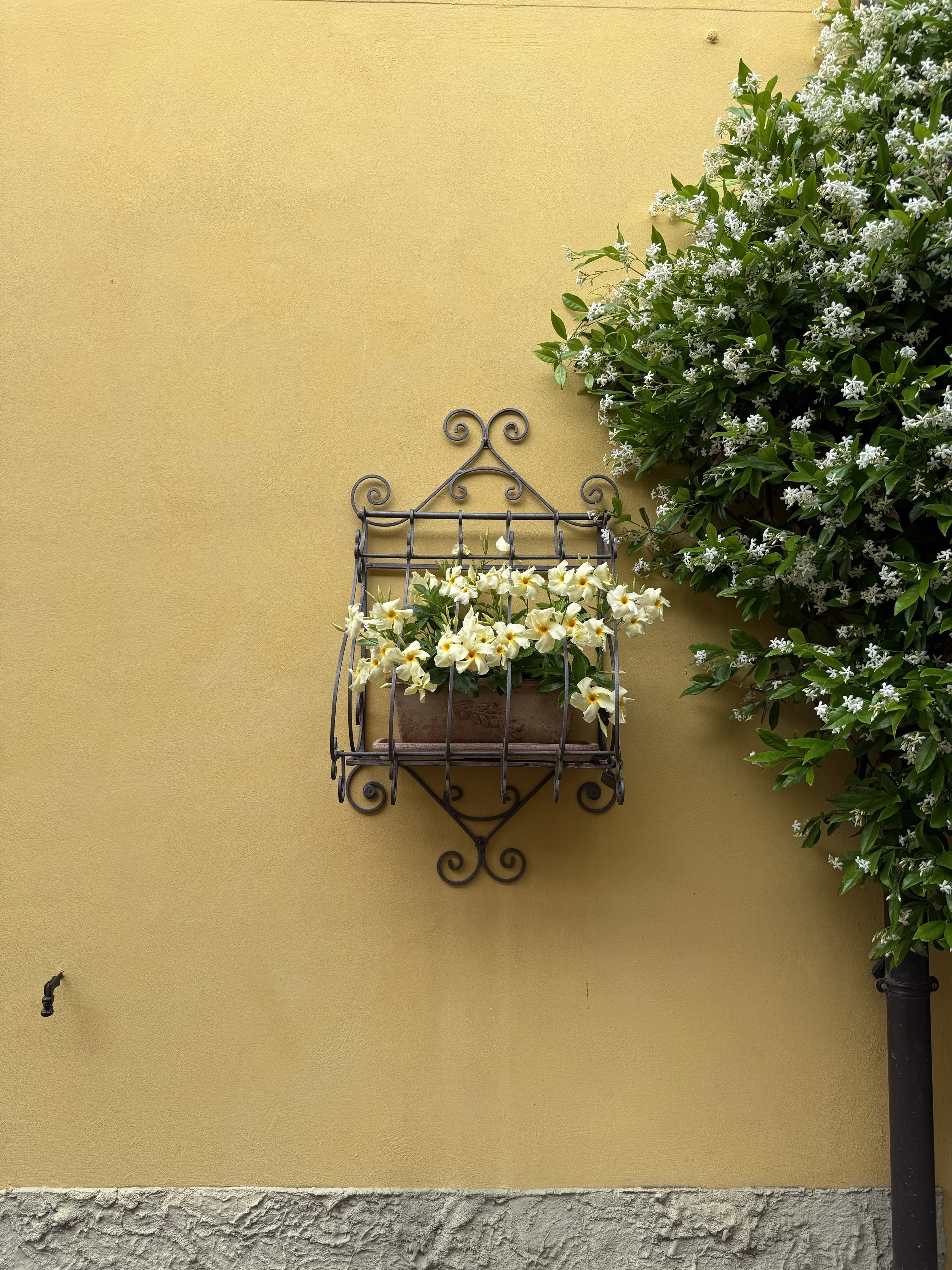 A yellow wall in Serralunga d'Alba with a decorative black metal wall-mounted planter holding white and yellow flowers. To the right, a large green shrub with white flowers partially covers a black drainpipe. View fullsize