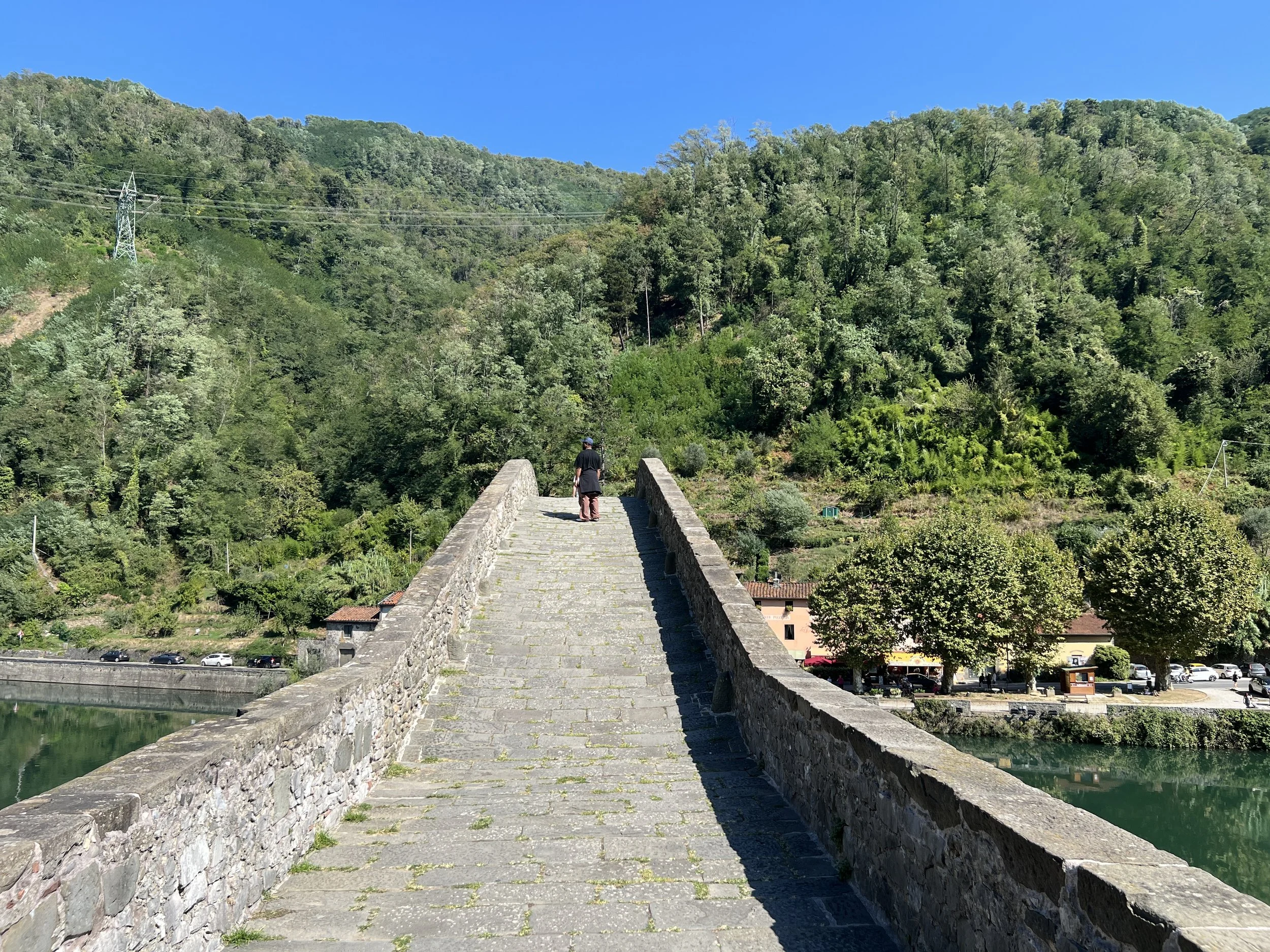 A stone bridge named the devils bridge over a river surrounded by green trees and hills, with a person walking on it and a clear blue sky.