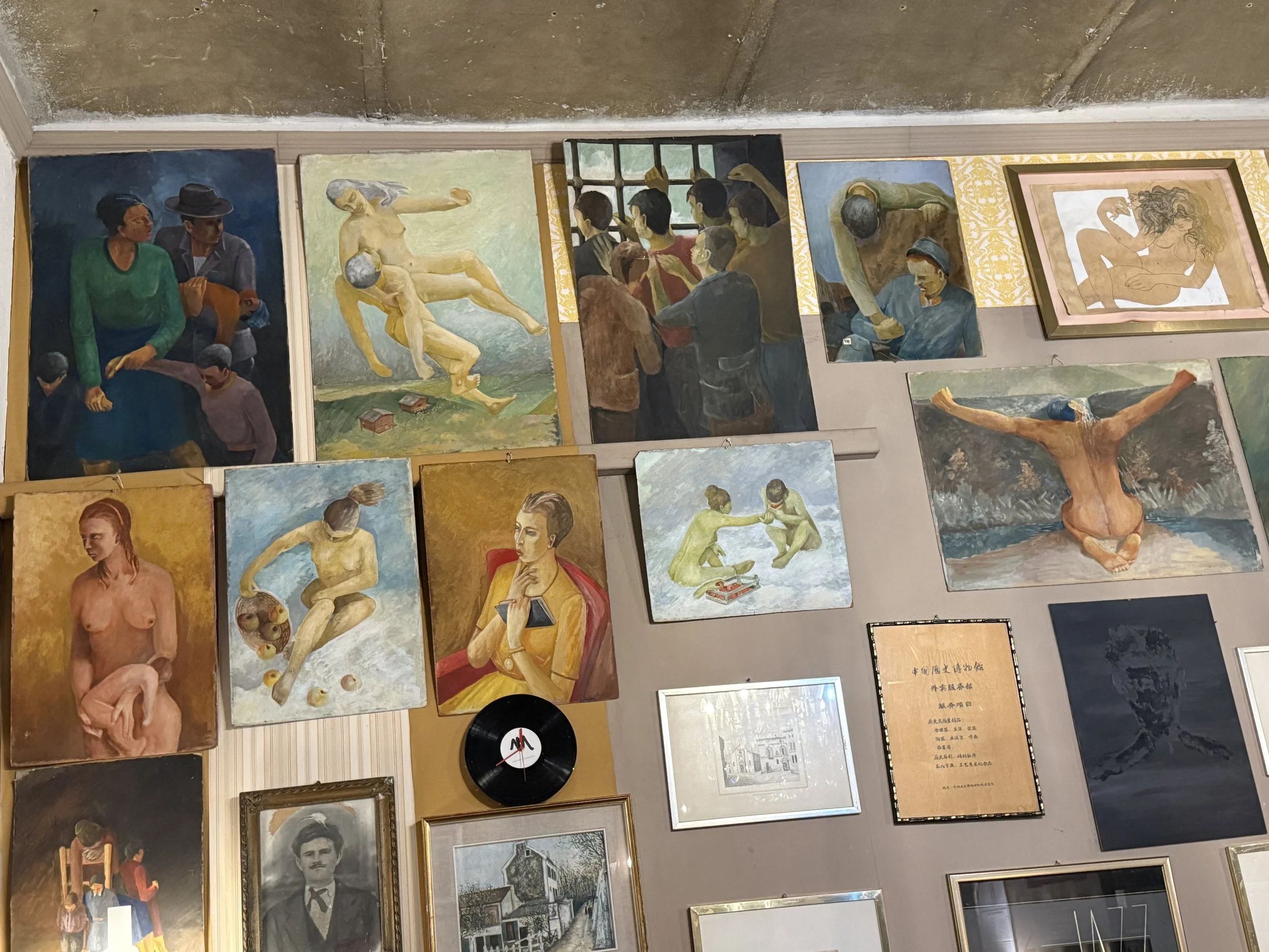 A wall covered with various framed and unframed oil paintings, portraits, and photographs of people, with some paintings depicting women, children, and groups in different poses and settings.