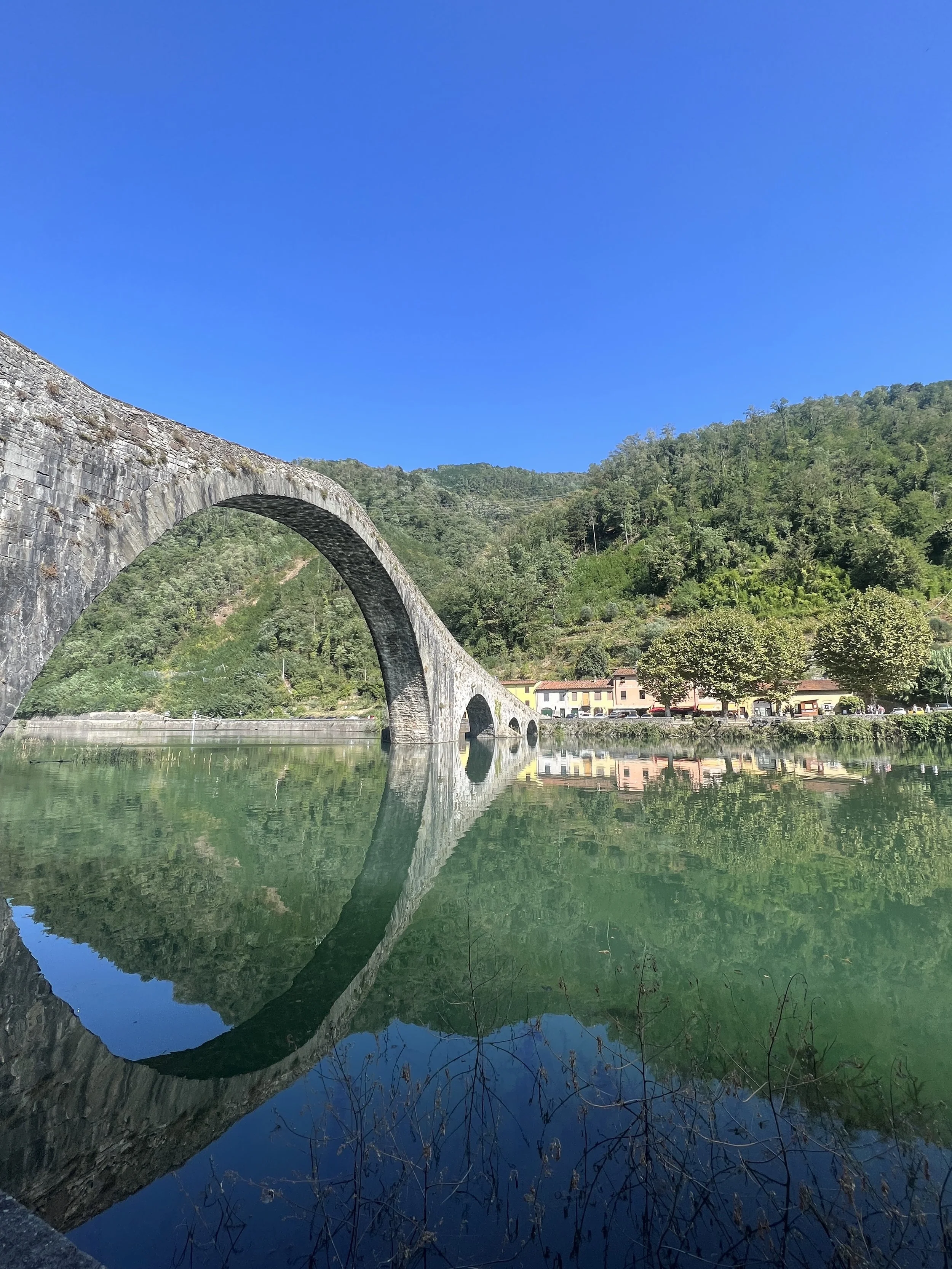 Stone arch bridge known as the devils bridge over a calm river with reflections of the bridge, green hillside, and small buildings, under a clear blue sky.