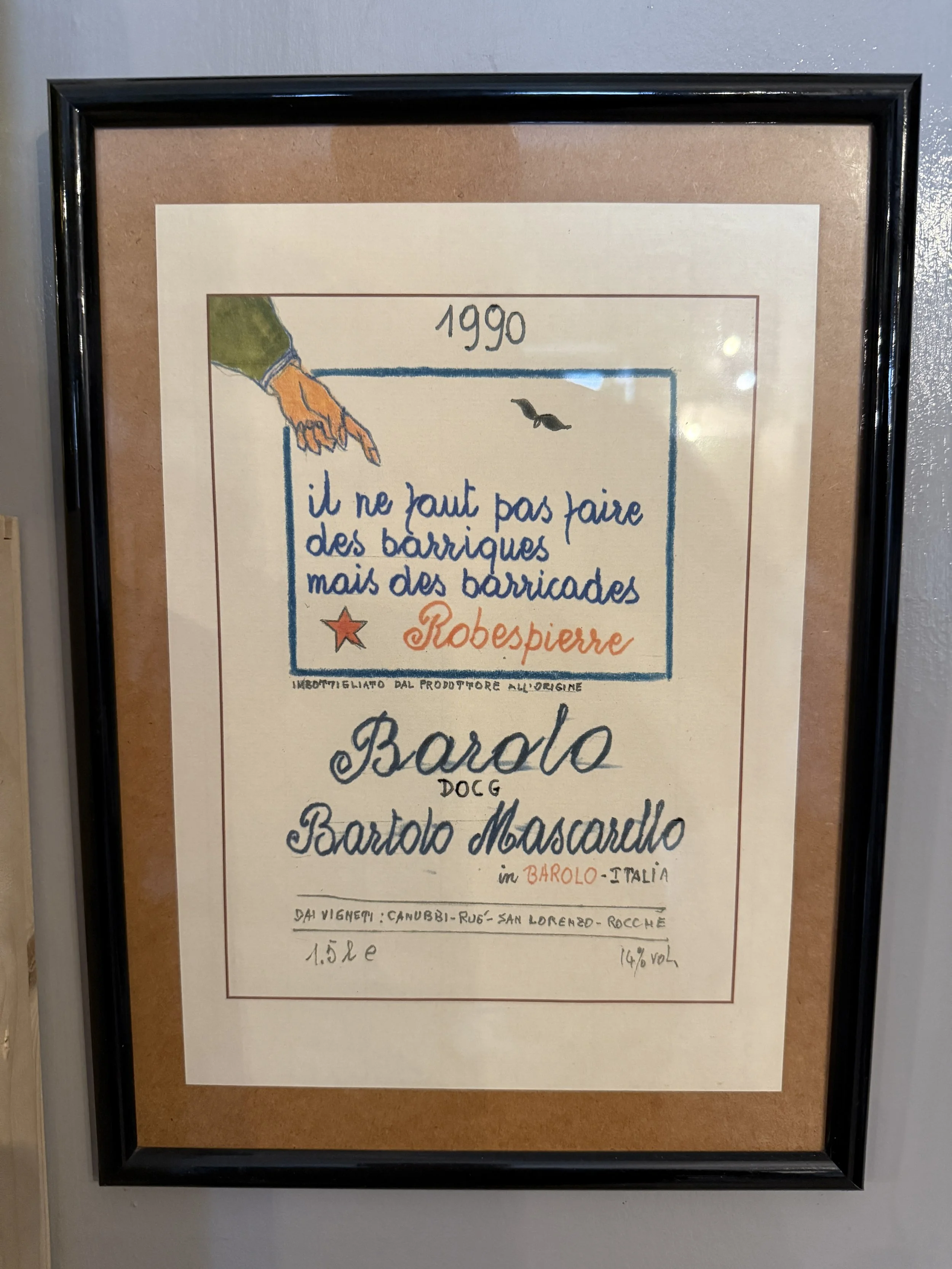 Framed vintage-style Bartolo Mascarello poster featuring text about Barolo wine from Italy, with an illustration of a hand pointing and a bird silhouette.
