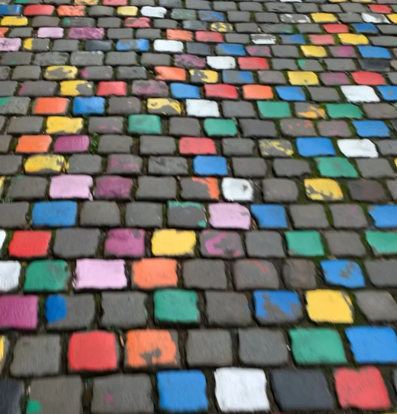 Colorful painted squares on cobblestone pavement in the town of Reims.