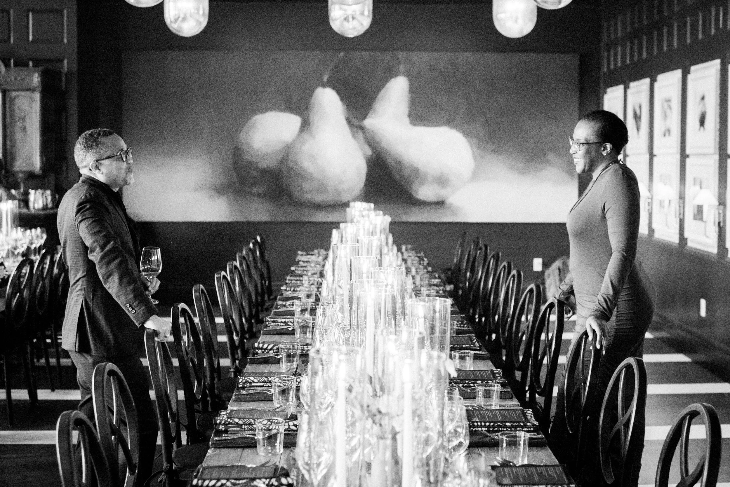 A man and woman standing at opposite ends of a long, elegant dining table in a restaurant during the famed Black on Black dinner is Aspen, with a large abstract painting on the wall behind them.