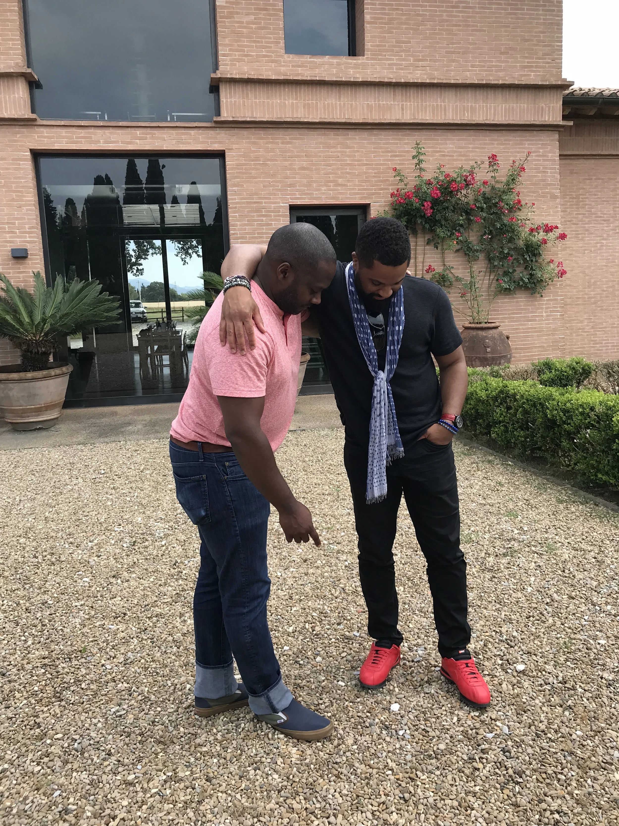 Two men standing close together outdoors, with one pointing at the ground and the other leaning in, in front of a brick building with large windows, potted plants, and a flowering bush in Bolgheri.