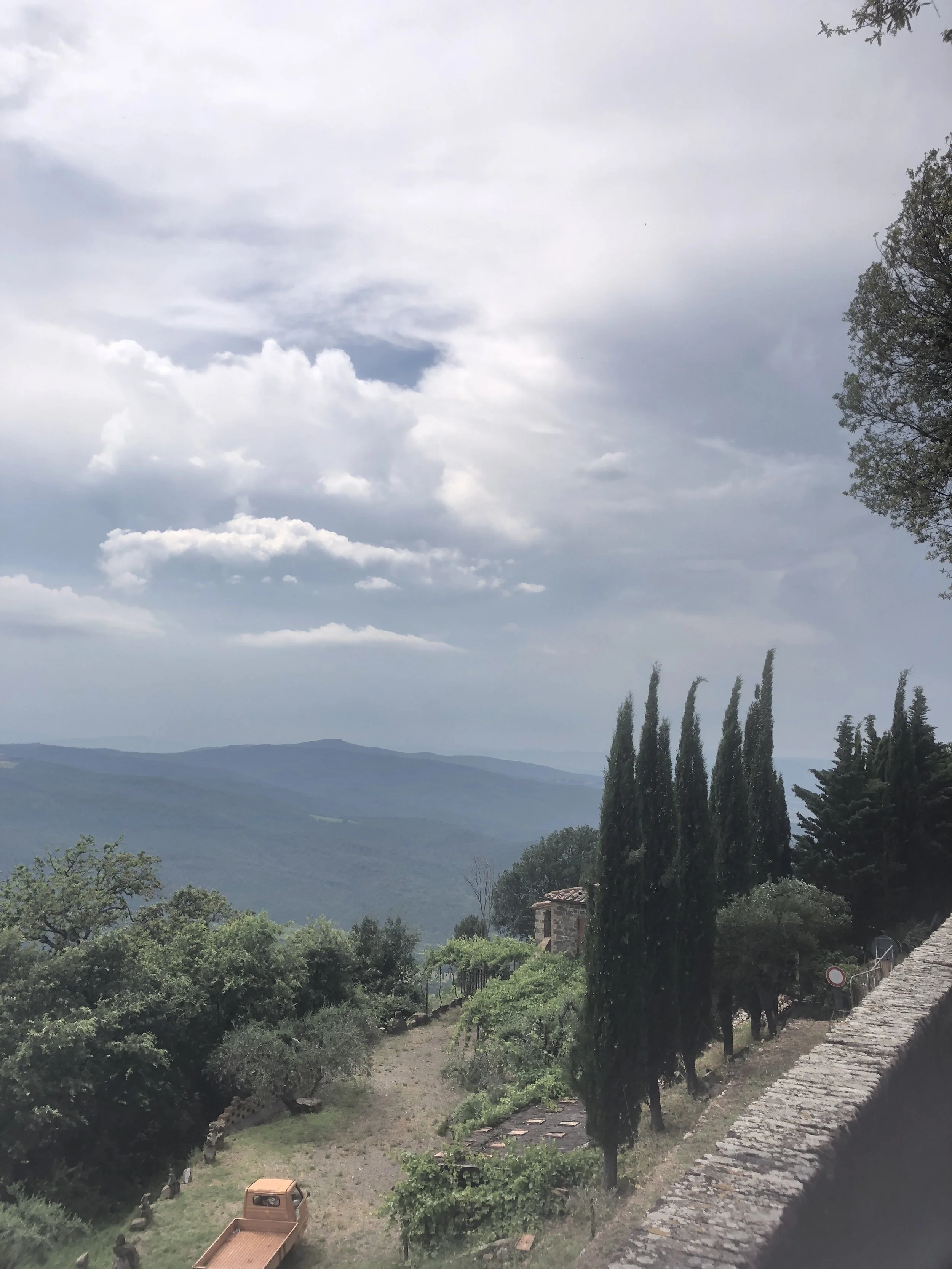 Scenic view of rolling hills and mountains in Montalcino with partly cloudy sky, tall cypress trees, a small stone building, and a stone wall in the foreground.