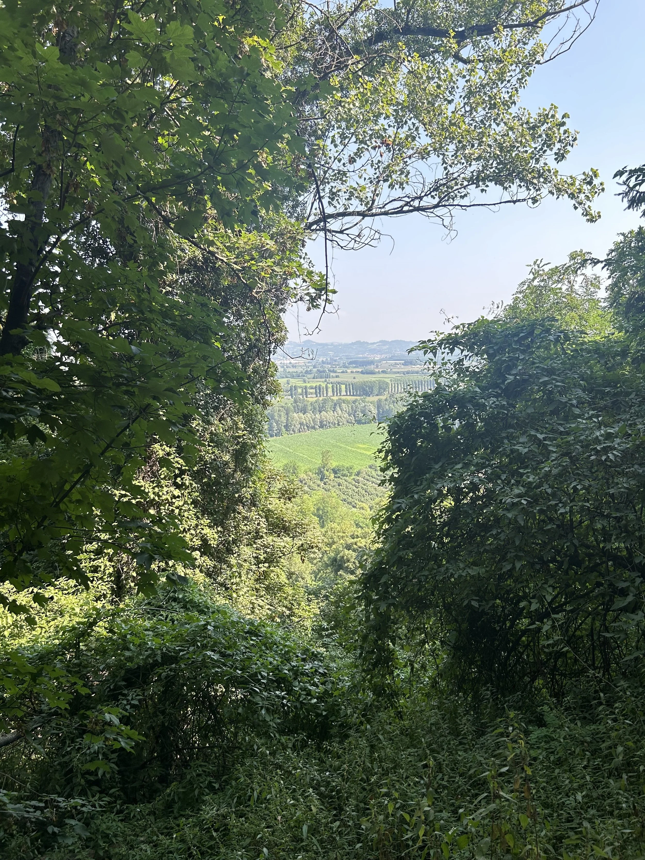 View through dense green foliage of Barbaresco revealing a distant lush, cultivated landscape with rolling fields, trees, and a clear blue sky.