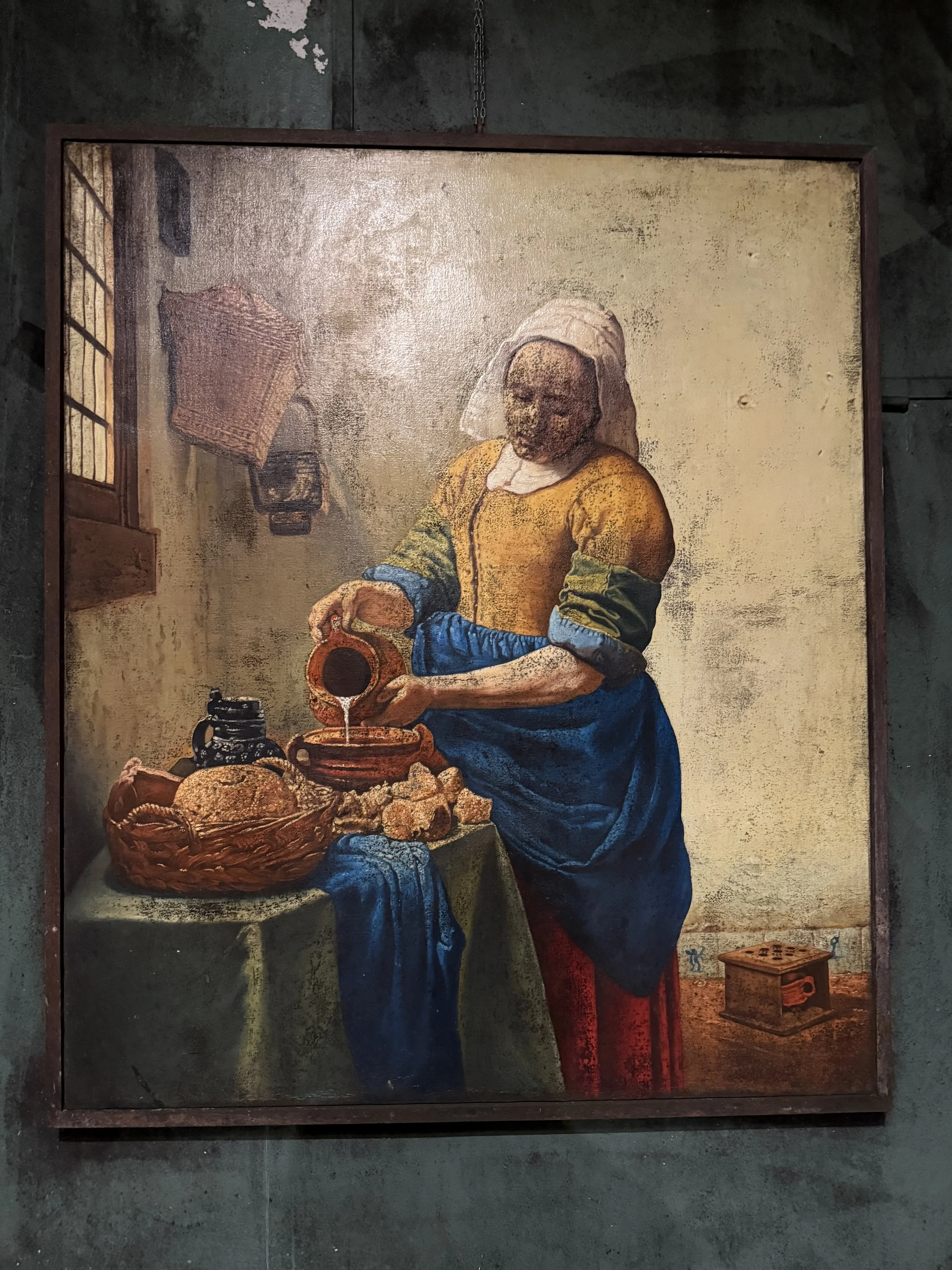 A series of distorting bathroom stalls with dark tiles on the floor, each featuring an old-fashioned metal toilet. At the end of the hallway, a wall features a classical painting of a woman with a dog, and the stall walls have peeling paint and stain View fullsize