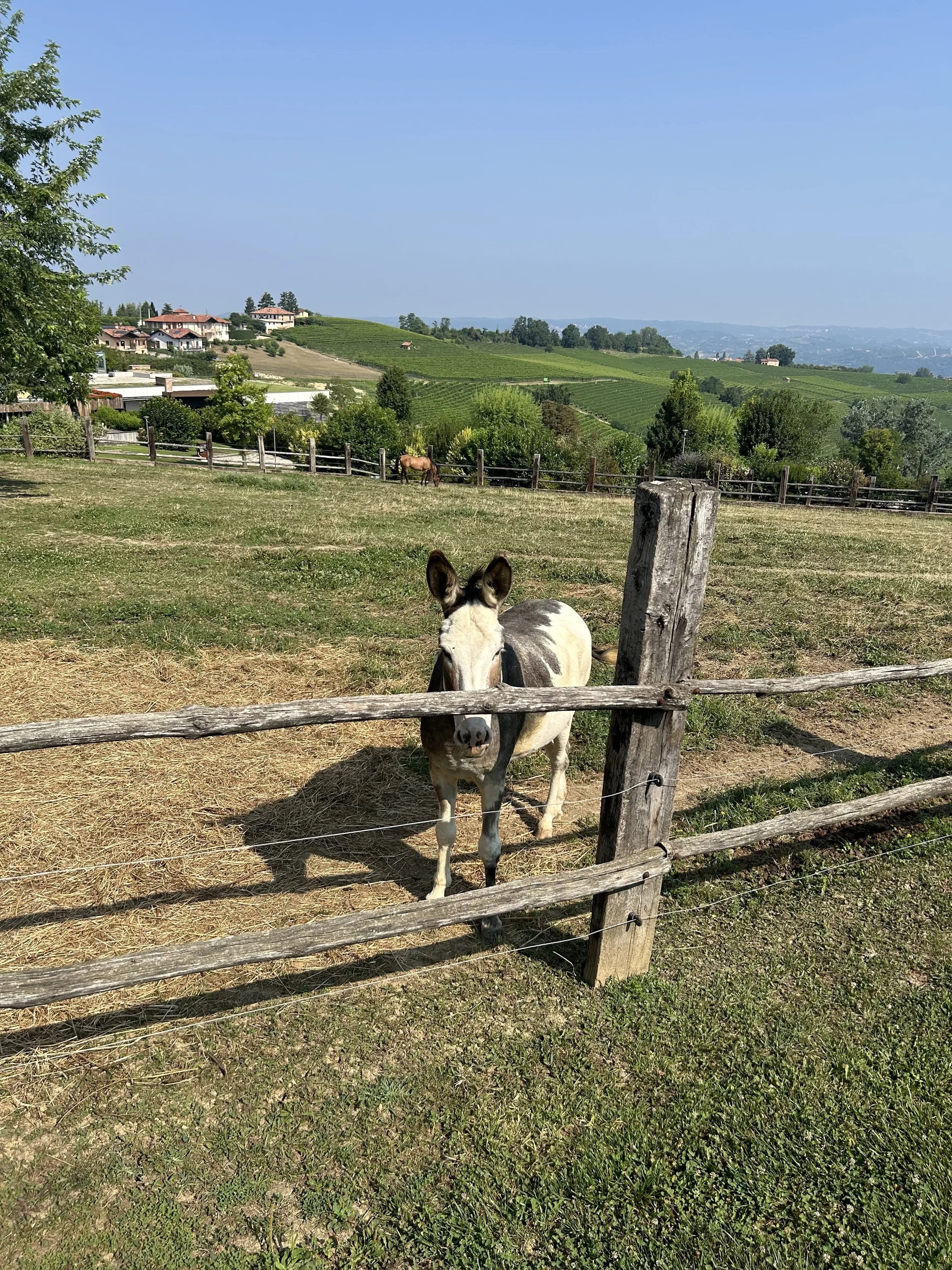 A young horse, or foal, standing behind a wooden fence at Relais Le Rocche in a grassy field, with rolling hills and houses in the background on a sunny day.