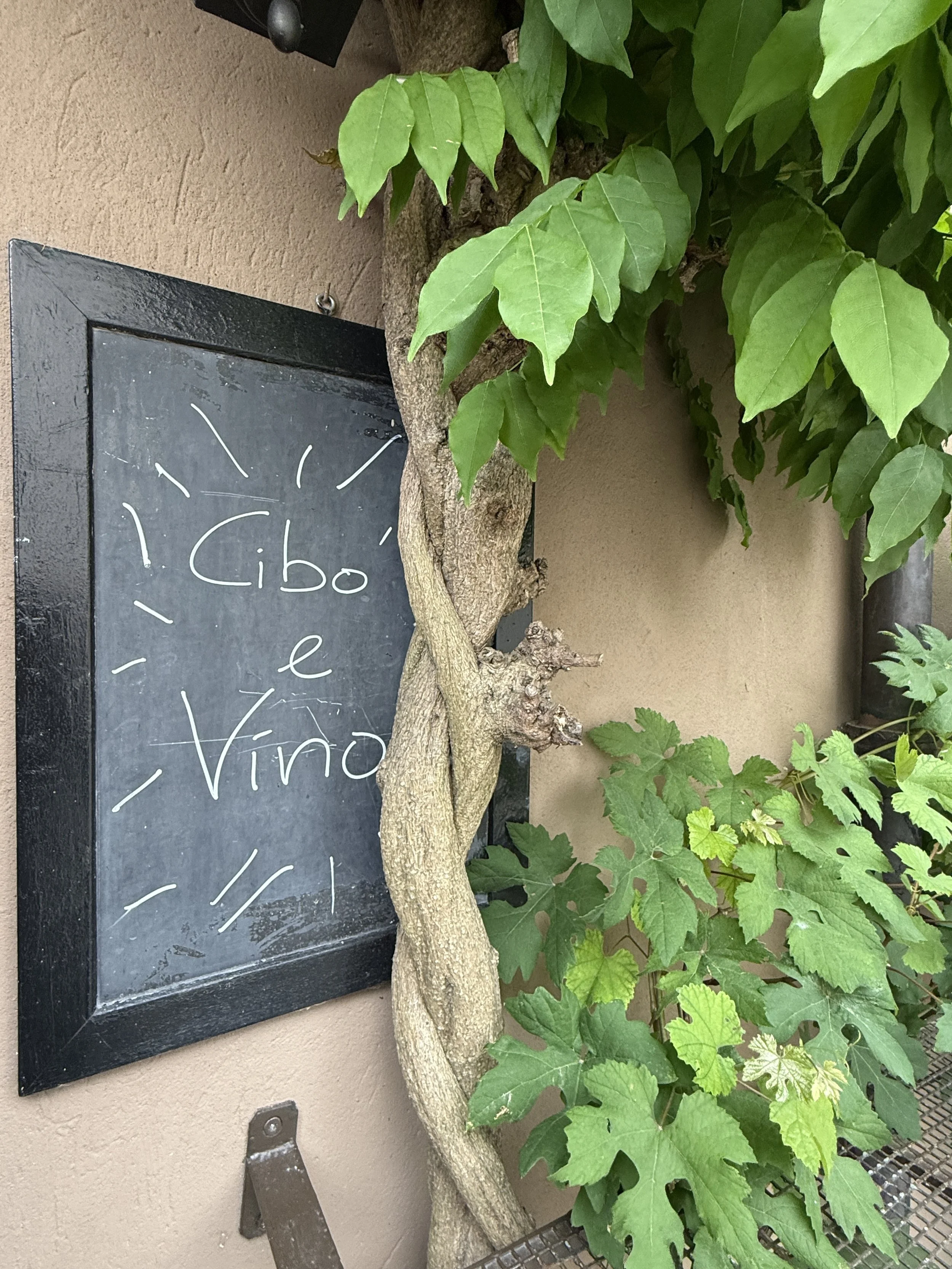 A black framed chalkboard sign with white writing that says 'Cibo e Vino,' surrounded by green ivy and a twisted tree trunk growing in front of it.