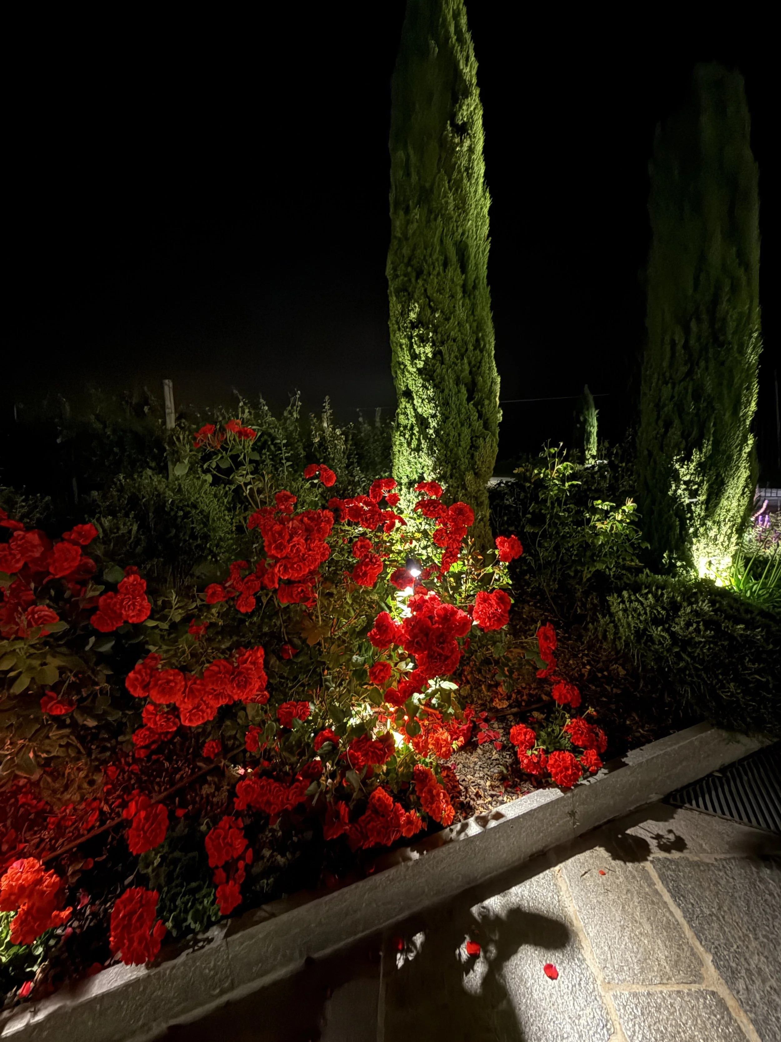 Nighttime garden scene with red flowers illuminated by outdoor lights, two tall green cypress trees in the background, and a stone path with shadows in La Morra.