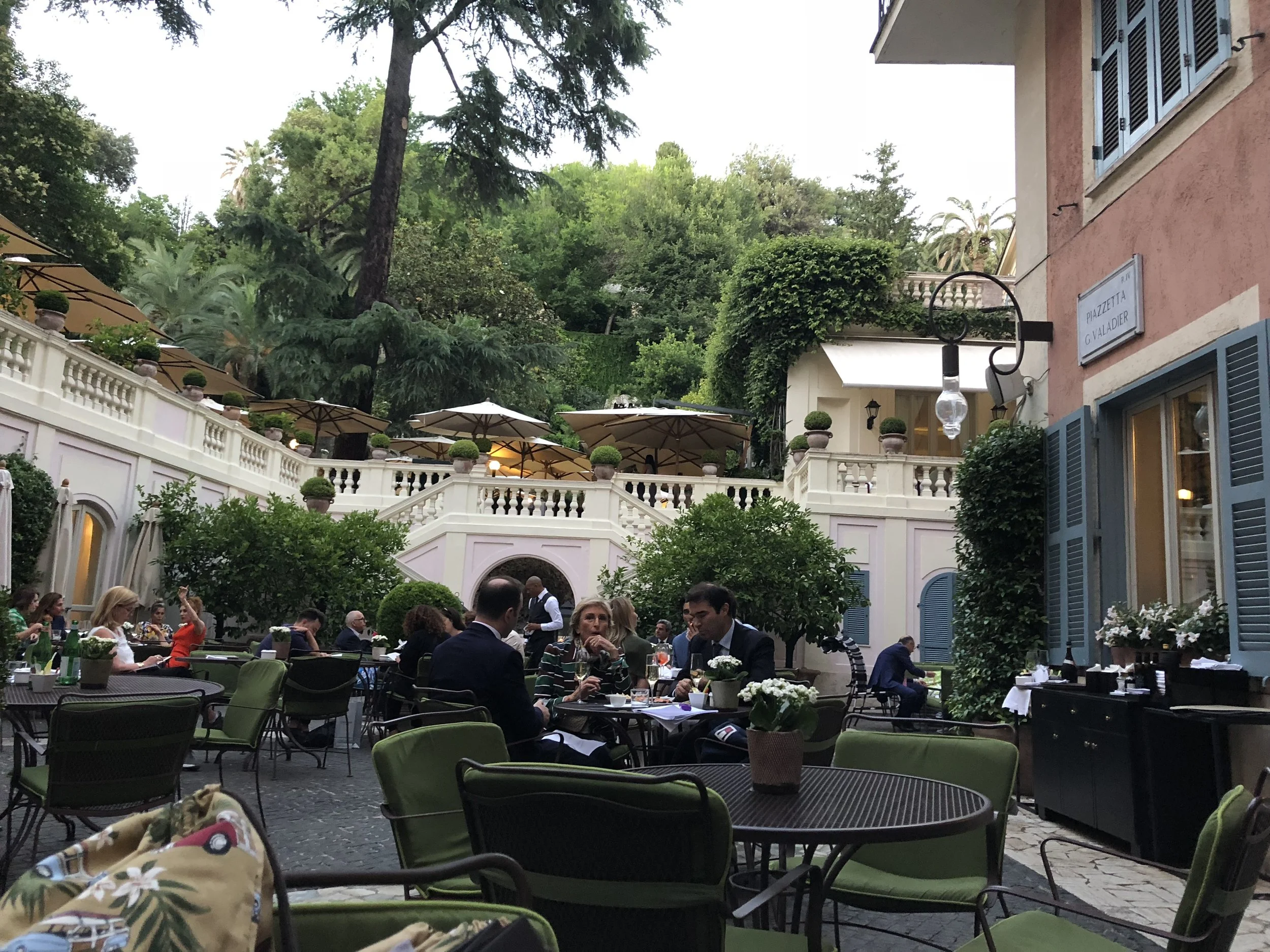 An outdoor cafe in Rome with people sitting at tables, surrounded by greenery and a pink building with blue window shutters. There are umbrellas over some tables, and a sign on the building reads 'PIAZZETTA G. VALADIER'.