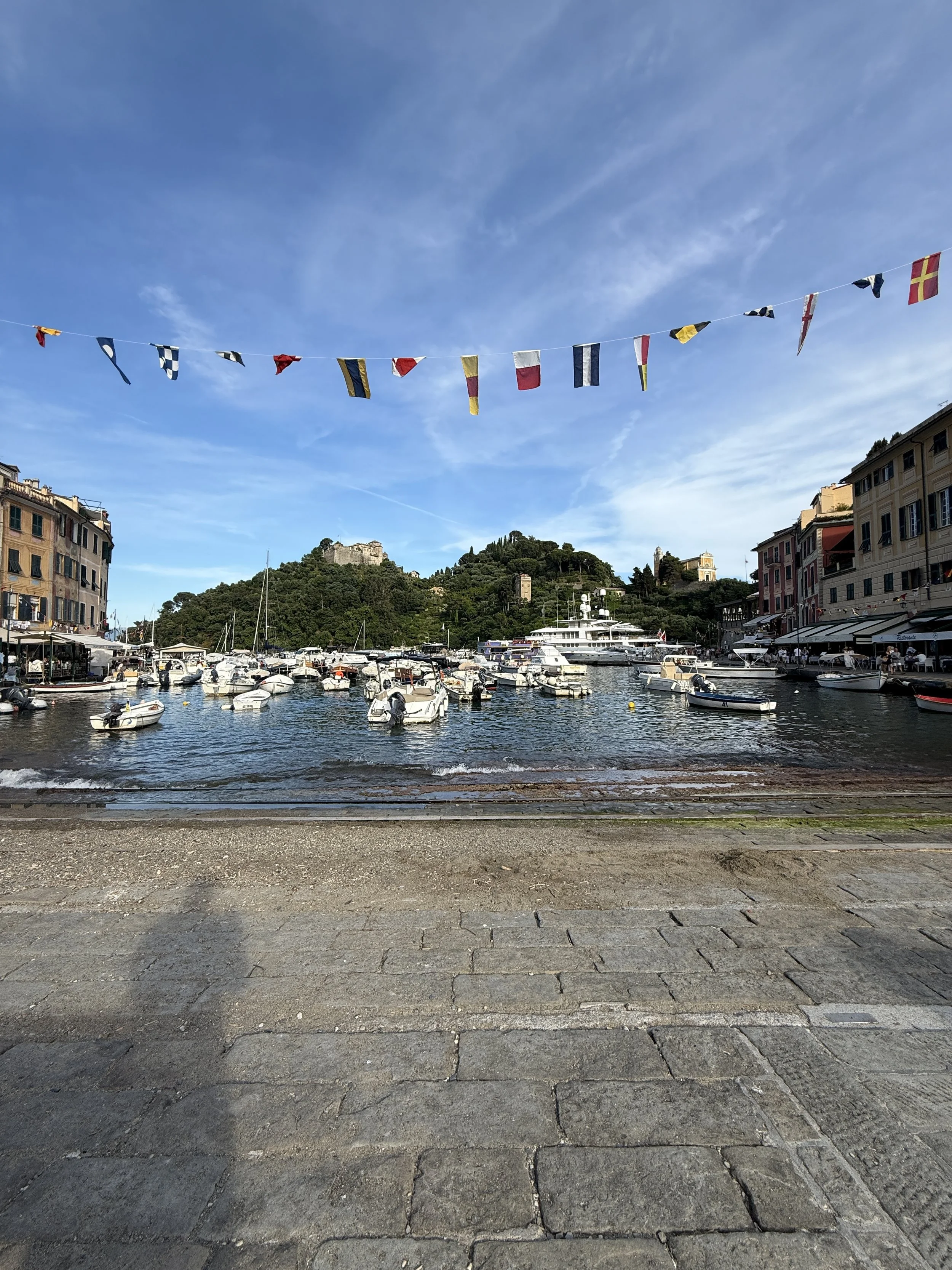 A harbor in Portofino with boats docked, colorful flags strung overhead, and buildings along the waterfront. A hill with trees and buildings is in the background under a bright blue sky.