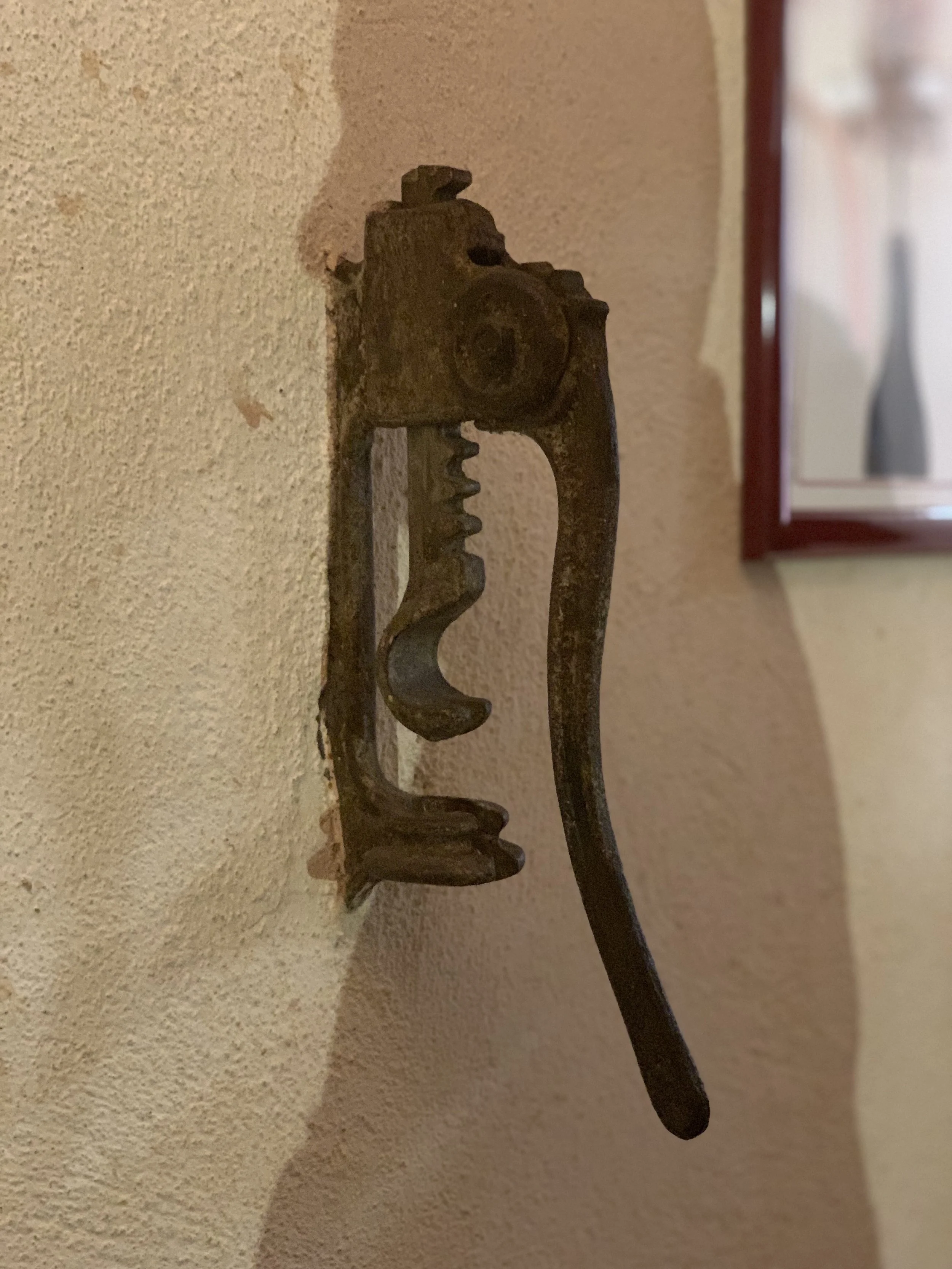 A vintage, rusted, metal bottle opener mounted on a beige wall. View fullsize