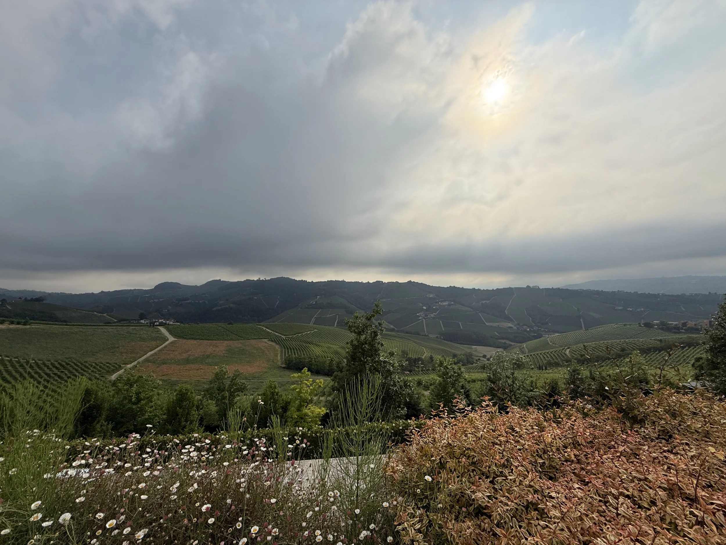 View of rolling green hills and vineyards under a cloudy sky with the sun partially visible overlooking Serralunga.